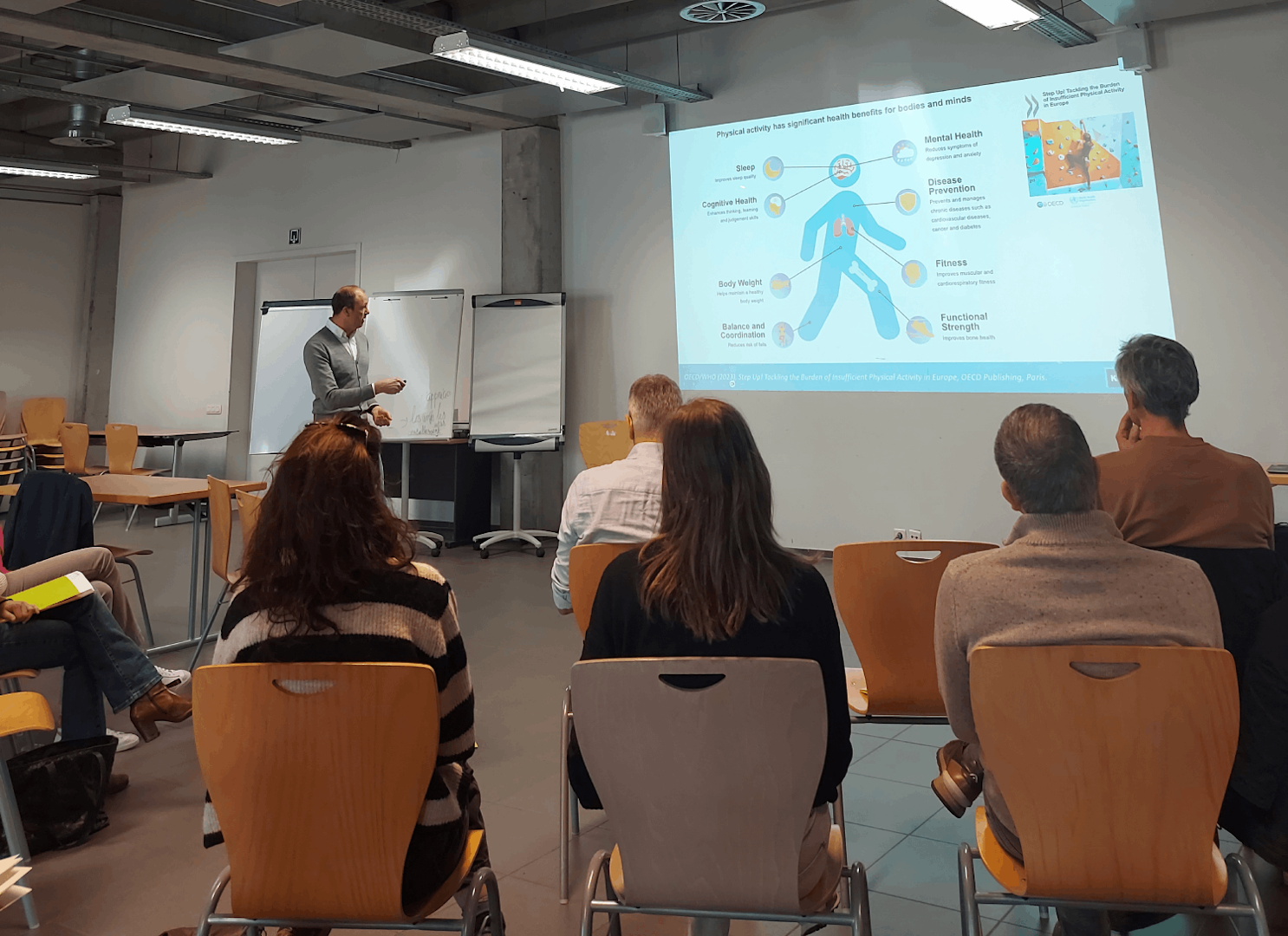 De dag begint met een leerrijke lezing van professor in de Lichamelijke Opvoeding Jan Seghers van KU Leuven. Met een schat aan kennis en ervaring op het gebied van beweging, deelde hij inzichten over hoe zowel arbeiders als bedienden meer kunnen bewegen voor, tijdens en na de werkuren.