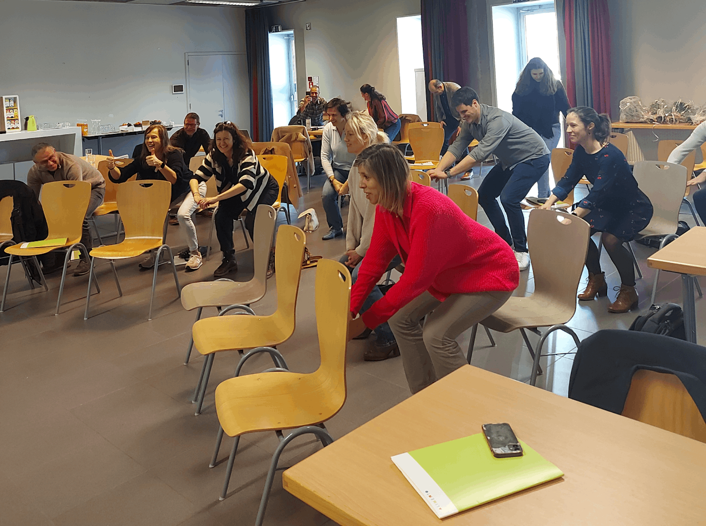 De handige tips van de professor werden meteen in de praktijk omgezet. Van squats tot lunges*: de deelnemers bleven niet gespaard van enkele spieroefeningen. En ook de lachspieren werden even gretig getraind... 😉